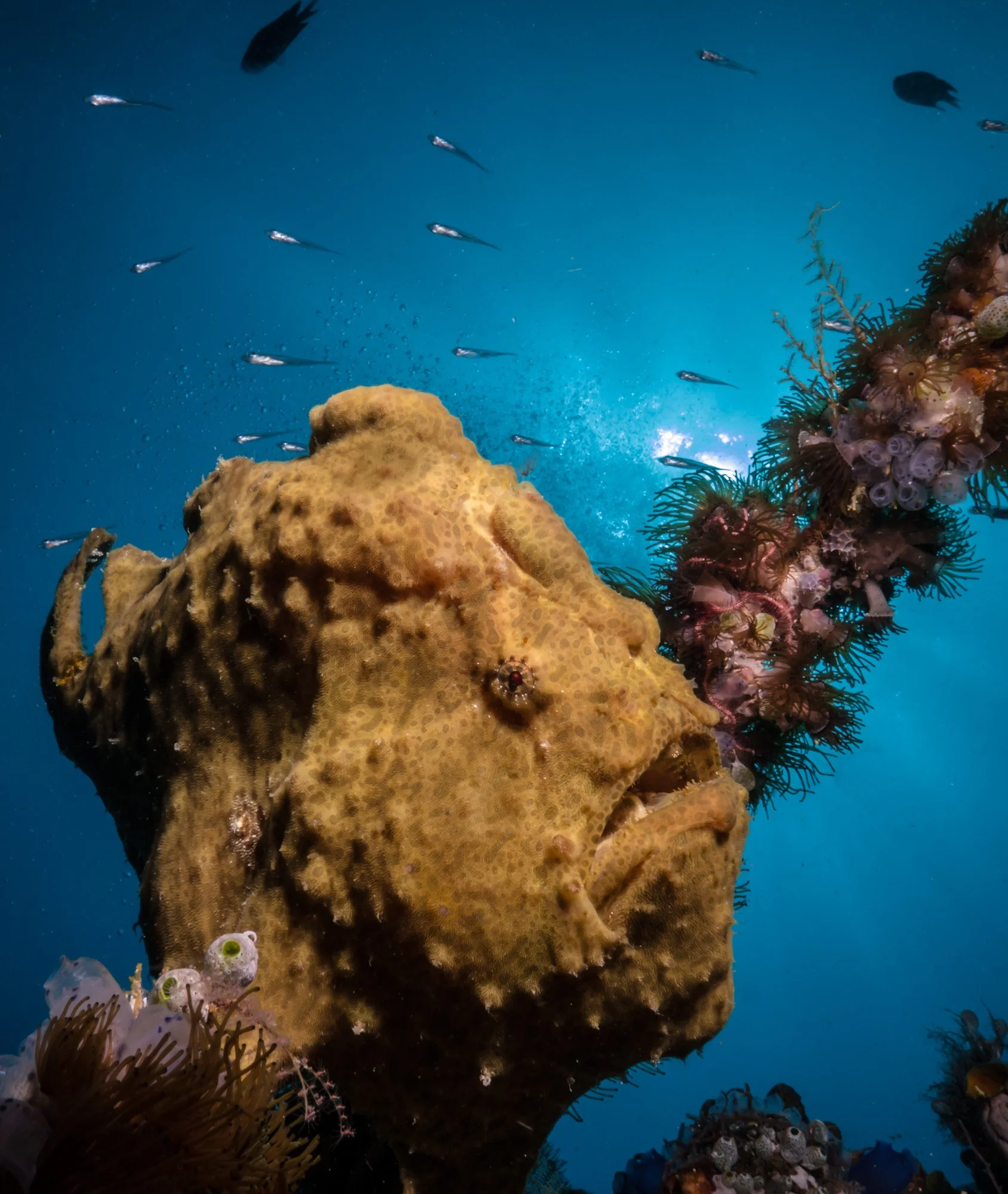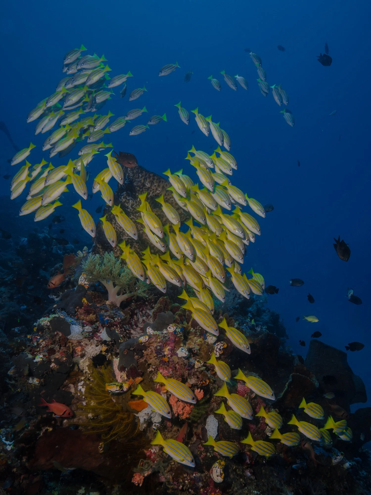 There are lots of fusiliers, butterflyfish, sweetlips, cardinal fish, and damsel fish everywhere. Lots of green and hawksbill turtles are seen swimming and sleeping on the reef walls. Bigger things like tuna, humphead parrotfish, wahoo, barracuda, and reef sharks are often seen swimming past the reef. Hiding on the wall there are lots of smaller critters such as scorpion fish, shrimps, nudibranchs, lionfish, and seahorses hidden on the walls.