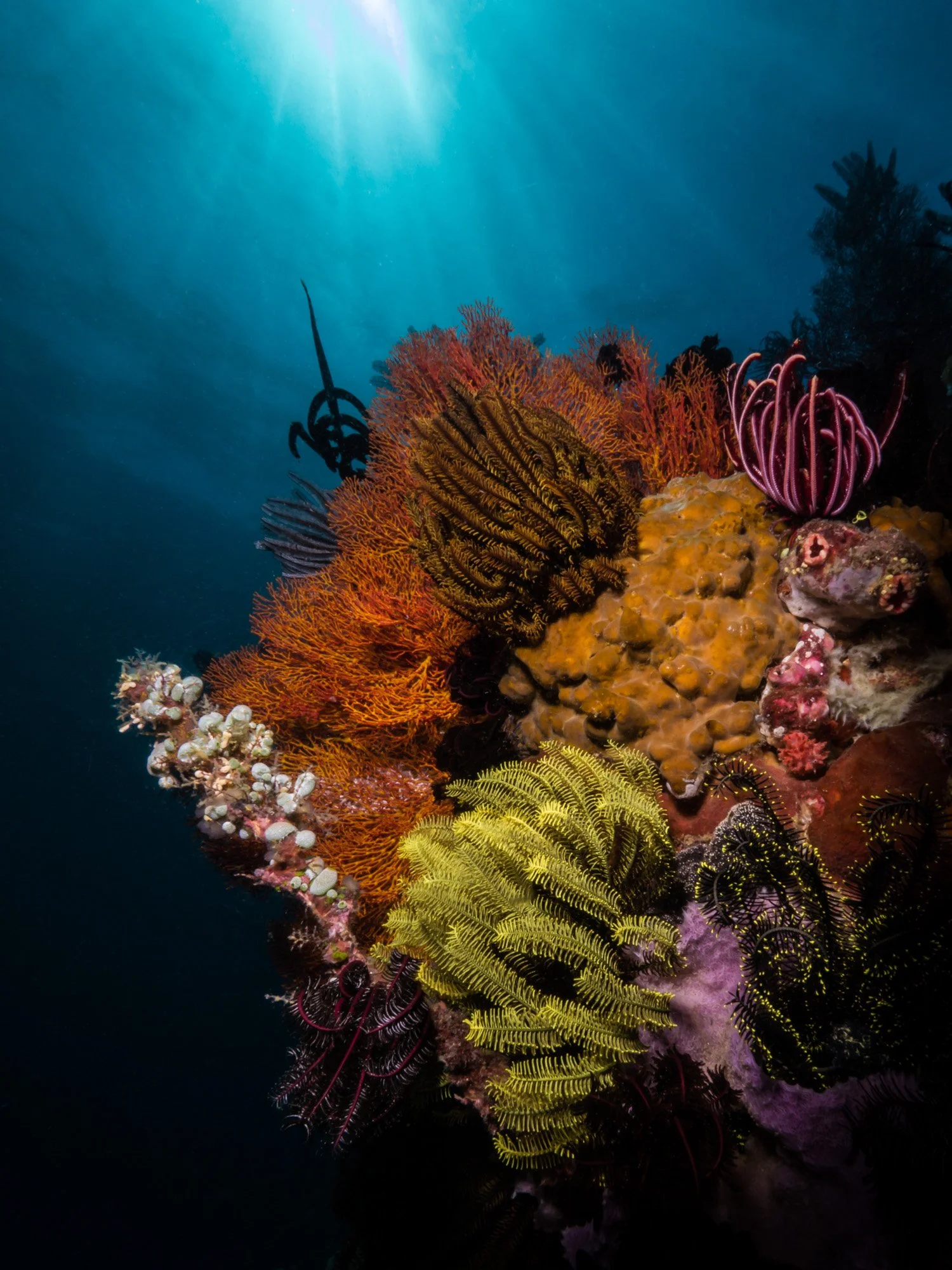The dive sites around Bunaken have dramatic drop-offs mixed with sloping areas and beautiful coral gardens at the tops of the reef. There is a huge variety of soft and hard corals that offer a home to an abundance of reef fish and critters.